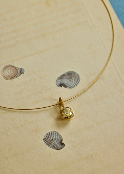 Some stones just tell you what they want to be: a singular, subtly sculptural pendant that follows the form of this unique cushion cut 2.02ct O-P SI2 diamond. The stone is set in 18k royal yellow gold which compliments the subtle warmth of the stone. An elongated bail sits on a 18k 16" wire cable collar.