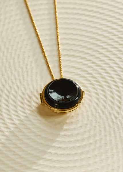 The original Stone Locket base with a sculptural update. Kate hand carved this onyx as an ongoing project that explores the idea of the thumbprint and the feeling of an impression as a token of remembrance.